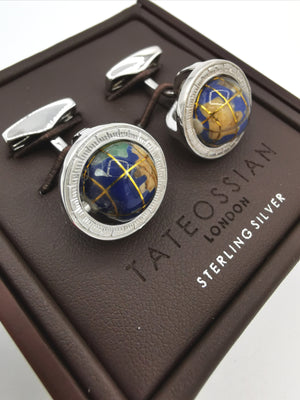 Fabriqués à la main en Angleterre, cet accessoires est devenu un best-seller depuis son introduction en 1995. Ce bouton de manchette a un globe rotatif incrusté de lignes latitudinales et longitudinales. Complément parfait à la collection de tout gentleman.